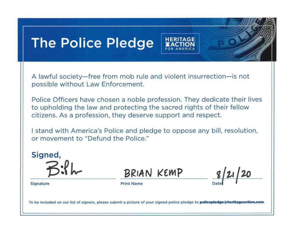 After signing the Heritage Action Police Pledge, Georgia Governor Brian Kemp issued the following statement: