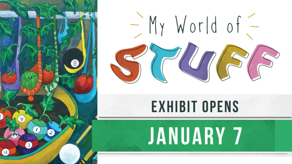 “Everything I have been exposed to throughout my life is in My World of Stuff,” Collins said. “By using illusion, absurdity and distortion, they take on a different appearance. The objects are colorful, fun, quirky, unrecognizable and recognizable – the understood and the not understood.”