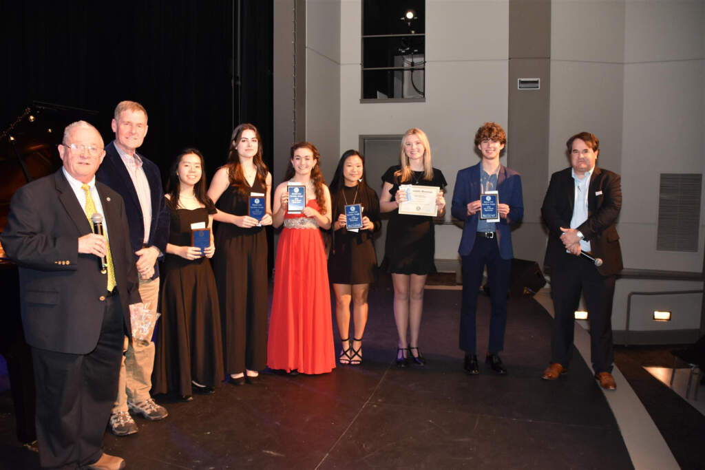 Photo: (L to R) Neil Weathington, Showcase Chair; Johnny Tanner, President; Yujean Shin, First Place; Skyler Elizabeth Hurley, Second Place; Eden Geise, Third Place, Emily Grace Hicks, Fourth Place; Madison Gail Brown, Honorable Mention; Tai Benjamin Jackson, Fifth Place; and Troy Vollenweider, Master of Ceremonies.