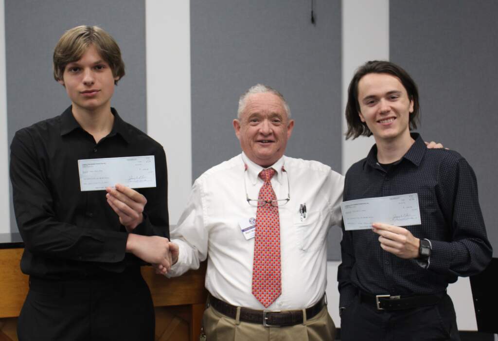Photo (l to r) Gray Langlo, Carrollton Sophomore, piano; Neil Weathington, Kiwanis Showcase Chair; and Connor Haley, Bassoon. Haley and Langlo won scholarship of five hundred dollars for performance of Movement II of Telemann’s Sonata in F Minor for Bassoon and Piano .